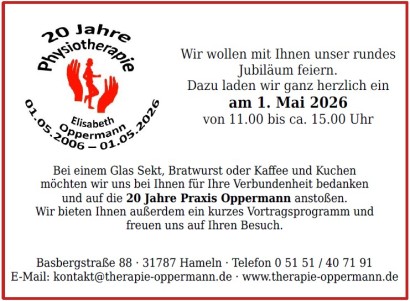 Unsere Physiotherapie Praxis wird 20 Jahre alt - und wir wollen mit Ihnen am 1. Mai 2026 gemeinsam unser rundes Jubiläum gebührend feiern!